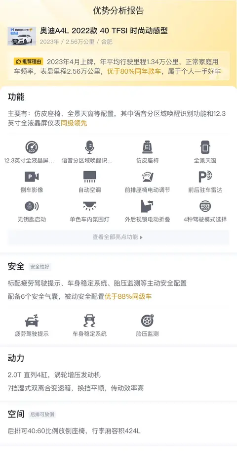 这辆奥迪A4L 2022款 40 TFSI 时尚动感型上牌地为安徽合肥,上牌日期2023年4月,表显里程2.56万公里,新车指导价32.18万,二手车报价18.3万,车身颜色白色,过户次数0次。该车搭载2.0T 190马力 L4发动机,最大功率(kW)140,最大扭矩(N·m)320,变速箱为7挡双离合,最高车速(km/h)230,官方百公里加速时间(s)8.2,百公里油耗(L)6.1,长x宽x高(mm)4858x1847x1439,轴距(mm)2908,行李舱容积(L)424,座位数(个)5,天窗类型可开启全景天窗,排放标准国VI。