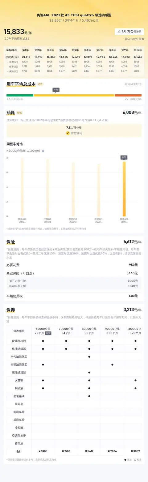 综上所述,奥迪A6L 2022款 45 TFSI quattro臻选动感型在动力、油耗、配置、空间、安全等方面均表现出色,是一款值得推荐的豪华中大型车。当然,购车不仅要考虑购车成本,还要考虑日常用车成本。根据懂车帝官方的大数据分析,奥迪A6L 2022款 45 TFSI quattro臻选动感型的10年平均用车成本大约在16473元/年,与同级别车型相比处于适中的水平。希望本文能够帮助您更好地了解这款车,为您的购车之旅提供有价值的参考。