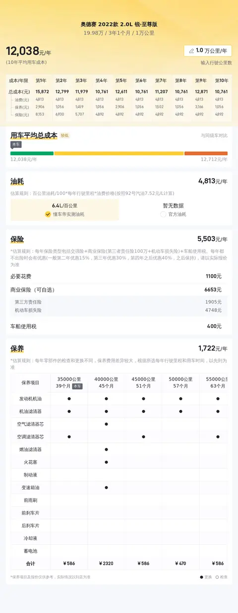 在用车成本方面,根据懂车帝的大数据分析,这辆奥德赛 2022款 2.0L 锐·至尊版的年均综合用车成本大约为1.2万元左右。这里值得一提的是,由于该车采用了油电混合动力,其燃油经济性较好,百公里油耗仅为6.2升(WLTC标准),这在一定程度上降低了使用成本。