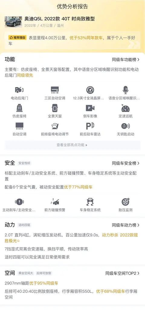 选购二手车时,除了车况,还需考量市场行情与用车成本。目前该车型的二手车市场价在20.15-24.55万元之间,这辆奥迪Q5L的定价位于中等偏上水平,考虑到其良好的车况和较少的行驶里程,这一价格较为合理。预计未来三年内,车辆的贬值幅度较小,保值性能良好。