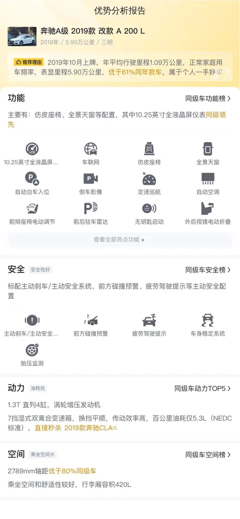 咱们先快速了解这辆二手奔驰A级的基础信息,它属于第五代车型,于2019年10月正式上牌,到现在跑了将近6万公里,个人一手车,车源所在地和上牌地为福建三明。当地有丰富的旅游资源,包括泰宁世界地质公园、永安桃源洞等自然美景,同时也有独特的客家土楼文化和红色旅游景点。这个车源地为买家提供了一个融合自然风光、历史文化及现代休闲的探索之旅。该车外观为白色搭配黑色车顶,个人认为这个颜色非常经典好看。