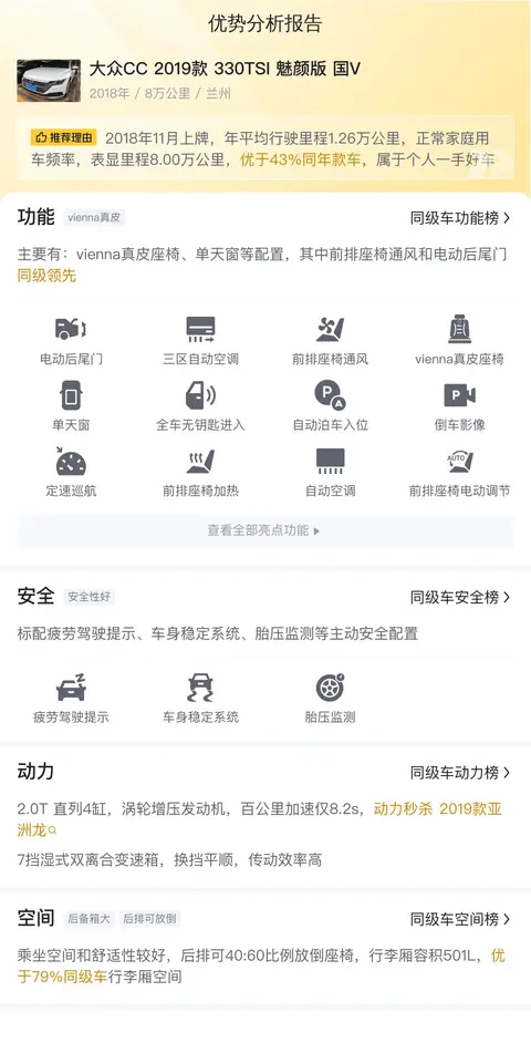 综上所述的新车含税价、用车成本、市场行情、优势分析、同款比价等数据仅供参考。在配置部分,因为二手车非标品,车辆可能会存在配置改装的情况,具体车况信息需要线下结合车辆实际情况进行综合参考。