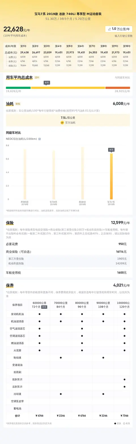据估算,同级车的最低用车成本是17788元/年,最高是47020元/年,宝马7系 2019款 改款 740Li 尊享型 M运动套装是23058元/年,所以用车成本适中。