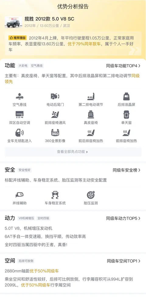 咱们来看看这辆车的市场行情。目前,它的报价为22.8万,相比新车指导价,便宜了197万。考虑到它是2012年的车型,且行驶里程为13.6万公里,这个价格还是比较合理的。根据大数据分析,这辆车的热度较高,且综合性价比指数为77%,对于感兴趣的朋友来说,或许是个不错的选择。在用车成本方面,按照每年2万公里计算,10年平均用车成本约为41189元/年。虽然油耗较高,但与同级别车型相比,这个成本还在可接受范围内。