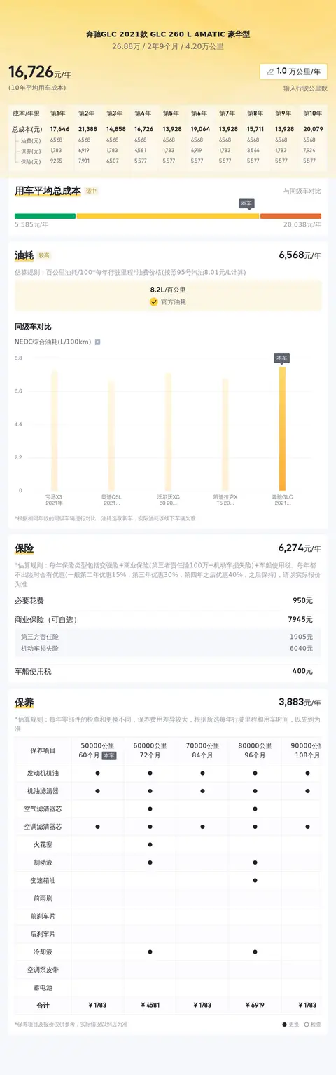 根据当前的市场行情,这辆奔驰GLC 2021款 GLC 260 L 4MATIC豪华型的二手车报价在24.06-29.27万之间。您的预算是多少呢?可以综合考虑一下。在用车成本部分,这辆车的官方百公里油耗是8.2升,按每年行驶一万公里里程计算,燃油费用约为6832元,年度商业保险约6141元,每年保养费用约4033元,平均年度用车总成本约17006元,当然具体用车成本金额还是要根据车辆实际使用情况而定。
