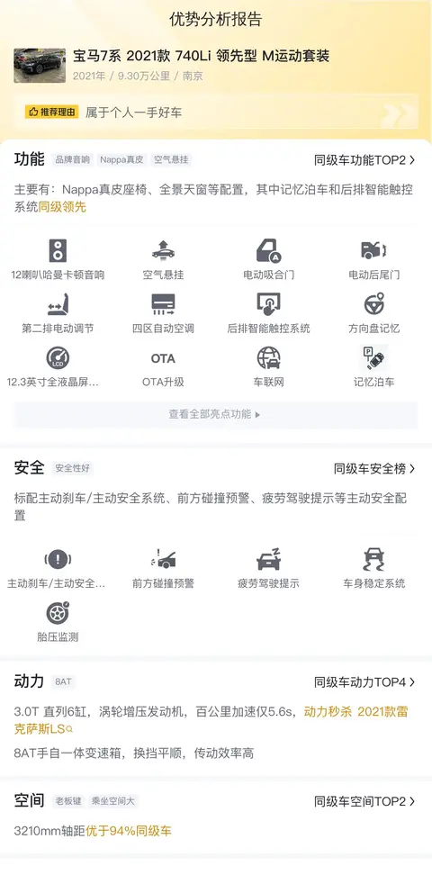 在市场行情方面,当前这款宝马7系2021款740Li领先型M运动套装的二手车价格区间大致在38.6万至47.57万之间。此外,根据估算,该车的十年平均用车成本约为21467元/年。