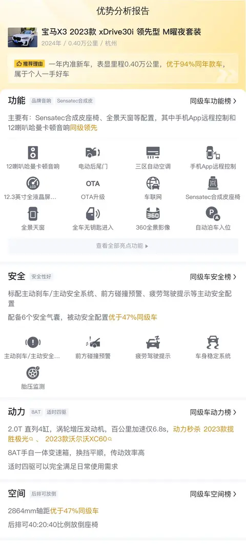 综上所述的新车含税价、用车成本、市场行情、优势分析、同款比价等数据仅供参考。在配置部分,因为二手车非标品,车辆可能会存在配置改装的情况,具体车况信息需要线下结合车辆实际情况进行综合参考。