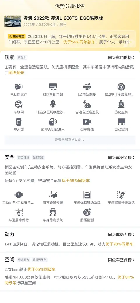 综上所述的新车含税价、用车成本、市场行情、优势分析、同款比价等数据仅供参考。在配置部分,因为二手车非标品,车辆可能会存在配置改装的情况,具体车况信息需要线下结合车辆实际情况进行综合参考。