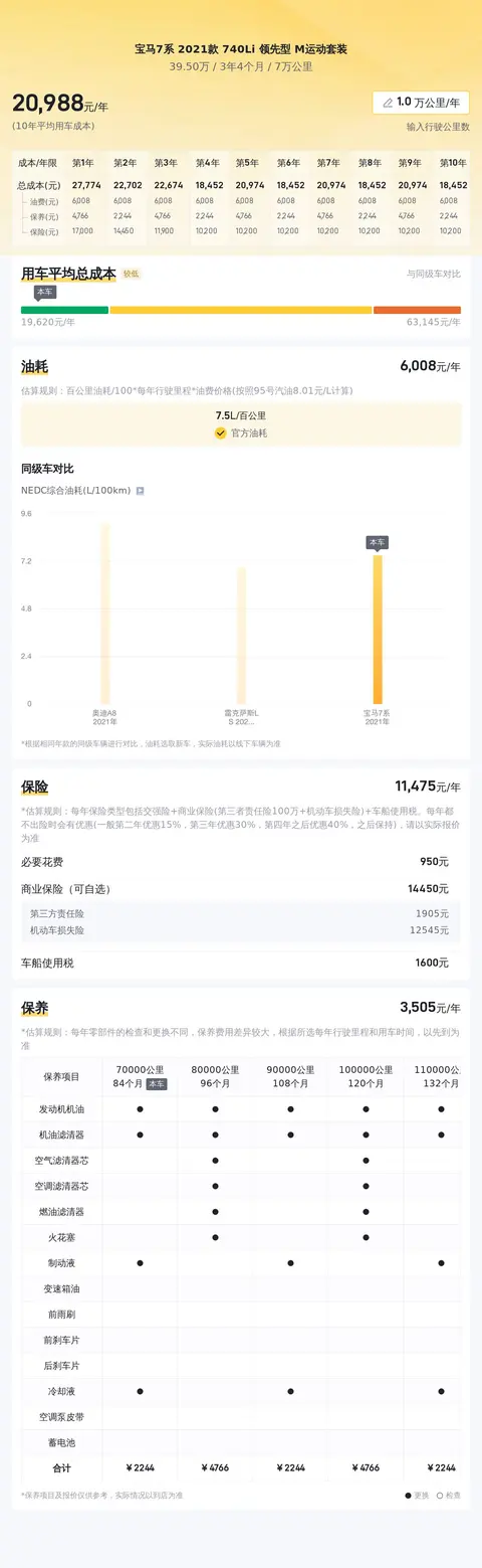 从用车成本来看,按照每年行驶2万公里计算,该车10年的平均用车成本约为25488元/年,与同级别车型相比处于较高水平。需要注意的是,这个数值是一个估算值,实际花费可能会根据车主的驾驶习惯、用车环境和车辆保养情况等因素有所不同。