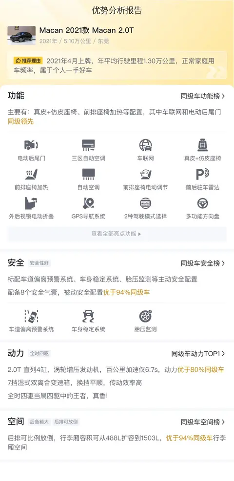 这辆2021款Macan 2.0T的首次上牌时间为2021年4月,至今行驶里程为5.1万公里,该车目前在东莞地区出售,上牌时间和车源所在地均为东莞,至今未有过户记录。按照新车指导价53.1万计算,目前的二手车报价为25.8万,相比新车价格便宜了27.3万。