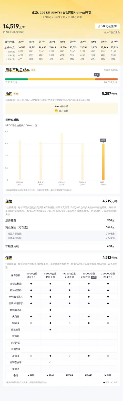 在用车成本方面,根据估算,该车的年均综合用车成本约为1.5万元左右。需要注意的是,实际费用支出可能会因个人驾驶习惯、用车频率等因素有所变动。
