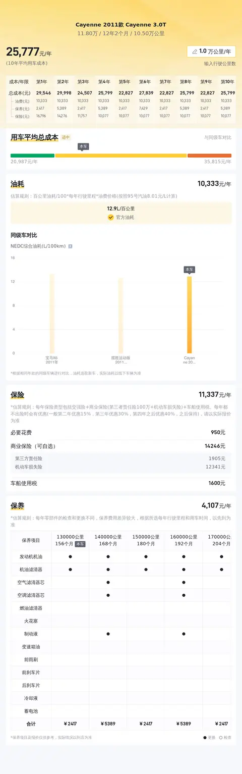据估算,同级车的最低用车成本是17788元/年,最高是27775元/年,保时捷Cayenne 2011款 Cayenne 3.0T是26164元/年,用车成本不算低,但应该也在可接受范围内。