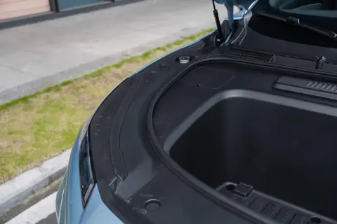 行李箱空间同样表现出色。标准状态下容积就很可观,而且内部形状规整,右侧还配有12V电源接口。后排座椅支持4/6比例放倒,通过先翻折坐垫再放倒靠背的方式,可以形成完全平坦的扩展空间。特别要提一下的是,当翻折后排坐垫后,露出的底部区域做工精细,没有多数同级车型常见的那种粗糙感,这可展现了不错的工艺水准。深蓝S05还配备了1.9平方米的全景天窗,增强了车内采光和空间感。座椅材质柔软亲肤,前排座椅配备通风和加热功能,副驾驶甚至提供腿托支持,可以实现“女王副驾”的躺平模式,大大提升了长途乘坐的舒适性。后备厢盖板底部还特别增加了隔音棉,这些小细节都体现了设计团队对品质的追求。