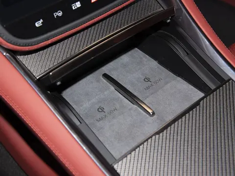 中控屏下方是两个手机无线充电的位置,最大功率50W,且可以用盖板盖上。后方是控制车载冷暖箱温度的触摸板。