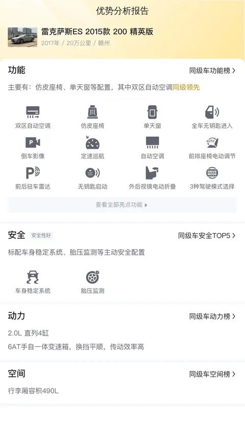 总的来说,雷克萨斯ES 2015款 200 精英版是一款集舒适性、宽敞空间和丰富配置于一身的豪华轿车。虽然动力表现一般,但对于追求舒适性和品质生活的消费者来说,它仍然是一款值得考虑的车型。需要注意的是,购买二手车时一定要仔细检查车况,确保车辆的质量。