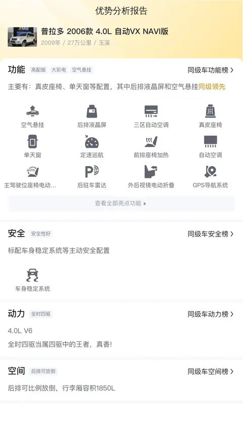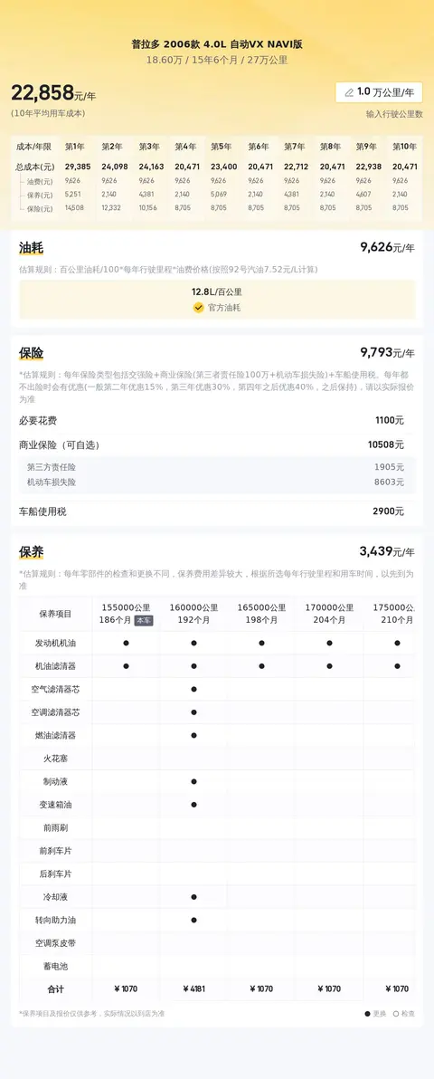 综上所述,这辆普拉多2006款4.0L自动VXNAVI版在配置和动力方面表现出色,是一款适合越野和家庭使用的SUV。然而,其较高的用车成本和15年的车龄可能需要潜在买家在购买前慎重考虑。如果您对这款车感兴趣,并且能够接受其较高的用车成本和车龄,那么它或许是一个不错的选择。反之,则建议您再看看其他车型。在购买二手车时,一定要亲自查看车辆实际情况,确保车况良好,避免出现不必要的麻烦。