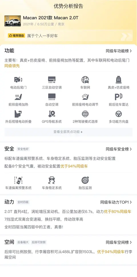 先让我们来了解一下这辆二手保时捷Macan的基本情况,该车具体版本为——Macan 2021款 Macan 2.0T。该车定位SUV,车身外观颜色为白色,内饰是深色配色。车源地和上牌地都在南京。2021年1月首次上牌,在此期间过户0次。同时该车至今累计行驶里程是6.5万公里,该车符合国VI排放标准。新车含税指导价为57.93万,而现在的二手车报价是32.8万。