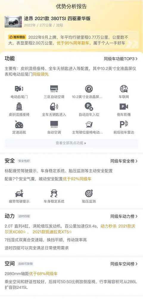 综上所述的新车含税价、用车成本、市场行情、优势分析、同款比价等数据仅供参考。在配置部分,因为二手车非标品,车辆可能会存在配置改装的情况,具体车况信息需要线下结合车辆实际情况进行综合参考。