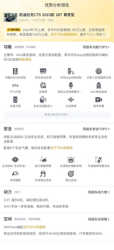 这款凯迪拉克CT5 2023款 28T 尊贵型专业测试表现良好,在同级别竞品车型中多项综合成绩名列前茅,是一款值得推荐的二手车。