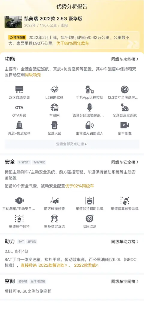 综上所述的新车含税价、用车成本、市场行情、优势分析、同款比价等数据仅供参考。在配置部分,因为二手车非标品,车辆可能会存在配置改装的情况,具体车况信息需要线下结合车辆实际情况进行综合参考。