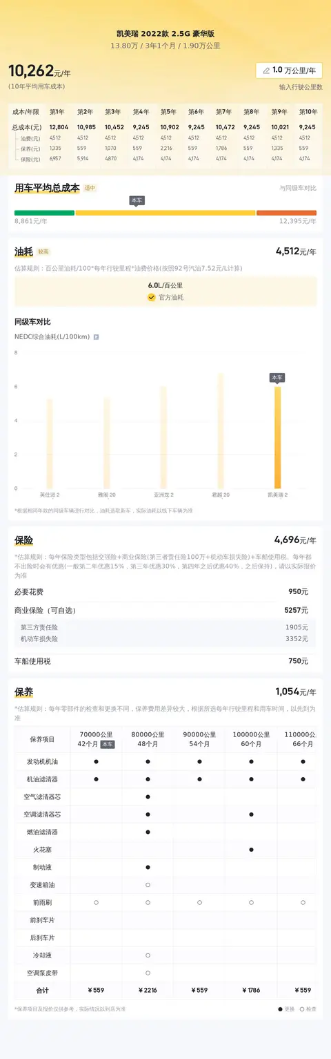 据估算,同级车的最低用车成本是8910元/年,最高是13773元/年,凯美瑞 2022款 2.5G 豪华版是10460元/年,所以不算低,算是正常水准。