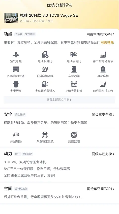 综上所述的新车含税价、用车成本、市场行情、优势分析、同款比价等数据仅供参考。在配置部分,因为二手车非标品,车辆可能会存在配置改装的情况,具体车况信息需要线下结合车辆实际情况进行综合参考。