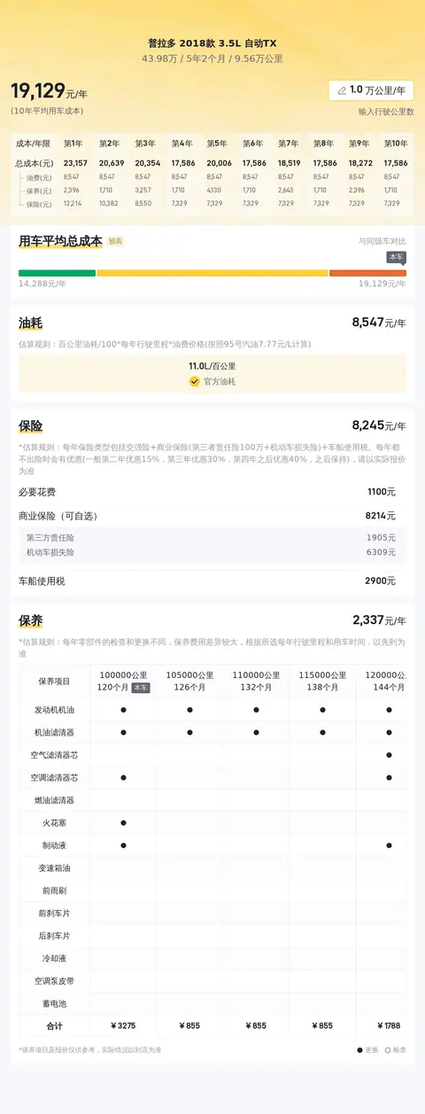 根据懂车帝的数据,这辆普拉多 2018款 3.5L 自动TX-L的二手车报价为43.98万元,相较于新车指导价45.08万元,便宜了1.1万元。这个价格在当前市场行情下较为合理,但是否值得购买还需根据实际车况和买家的需求来判断。此外,据懂车帝估算,该车十年平均用车成本约为1.9万元/年,其中包括油费约1.3万元/年、保养费约3,700元/年、保险费约6,700元/年。需要注意的是,实际费用可能会因多种因素而有所不同。