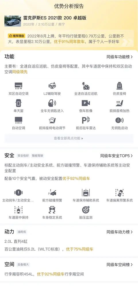 综合来看,这辆雷克萨斯ES 2021款 200 卓越版的各方面表现都不错,尤其在安全配置上,更是优于92%同级车,同时油耗低,用车成本不高,价格也比较合适。唯一不足的是里程数有点低,但也会因为里程数少而加分,毕竟少于均值2.4万公里,会增加车子的售价,而这辆车本身的价格就比较占优势。