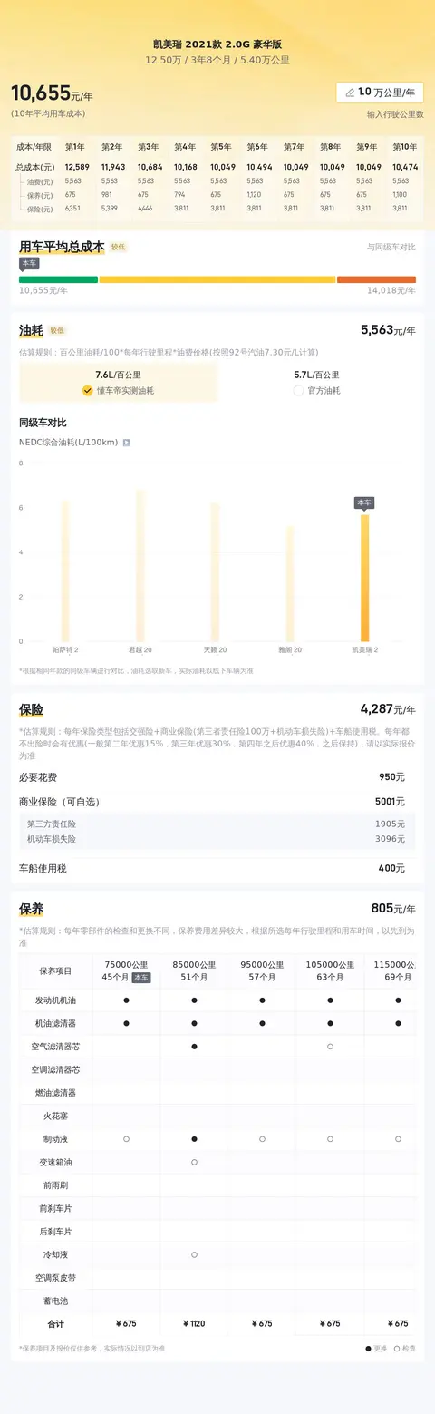 据估算,同级车的最低用车成本是5178元/年,最高是13983元/年,凯美瑞 2021款 2.0G 豪华版是10678元/年,用车成本适中。