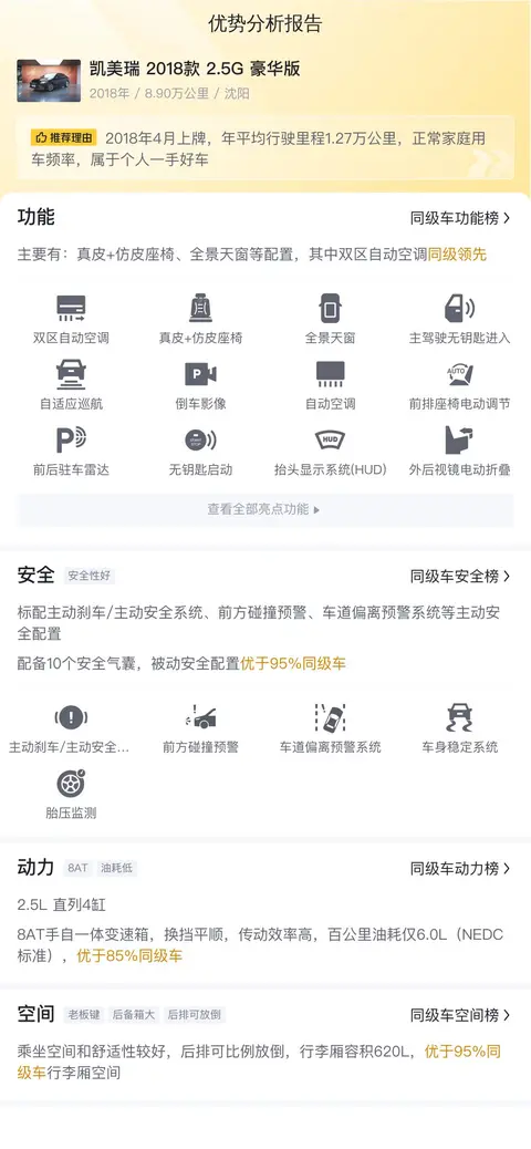 综上所述,这辆二手凯美瑞2018款 2.5G 豪华版在功能配置、动力性能、空间表现以及价格影响分析等方面都表现出色。虽然它是一款2018年的老款车,但其卓越的品质和稳定的性能仍然让它在市场上具有较强的竞争力。如果您正在寻找一款性价比高、性能出色的中型轿车,那么这辆二手凯美瑞无疑是一个值得考虑的选择。