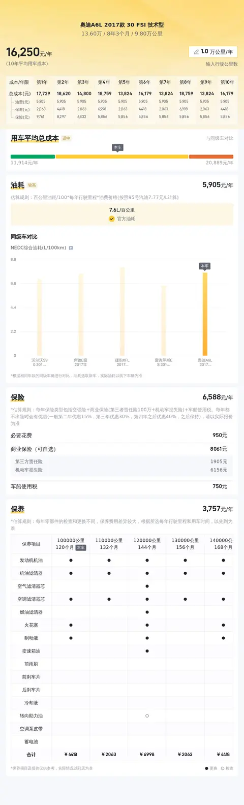 从用车成本来看,这辆奥迪A6L 2017款 30 FSI 技术型的10年平均成本大约为16180元/年(按每年行驶1万公里计算),而同级车的最低10年平均成本为13464元/年,最高10年平均成本为19420元/年,所以这辆车的用车成本适中。