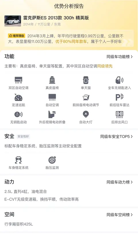 这款二手雷克萨斯ES 2013款 300h 精英版在舒适性、动力以及油耗控制方面占有一定优势。雷克萨斯ES向来以舒适著称,无论是座椅触感还是行驶静谧性,都为驾乘者提供了高标准的享受。动力方面,2.5升自然吸气发动机加上电动机的组合,确保了车辆拥有充沛的动力输出,同时又兼顾了燃油经济性。官方给出的NEDC综合油耗仅为5.4L/100km,这对于一款中大型轿车来说,无疑是一个相当出色的数值。