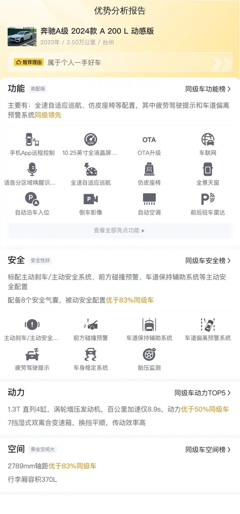 据估算,奔驰A级 2024款 A 200 L 动感版的用车成本是4940元/年,不算低,同级车的最低用车成本是4104元/年,最高是6238元/年,所以价格适中。