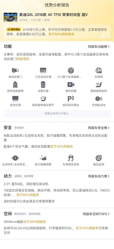 总的来说,如果你正在寻找一款性价比高、性能出色且配置丰富的豪华中型SUV,那么奥迪Q5L 2018款 40 TFSI 荣享时尚型 国V绝对是一个值得考虑的选择。当然,在做出最终决定之前,你还可以对比一下其他竞品车型,以便更好地了解市场动态和各款车型的特点。