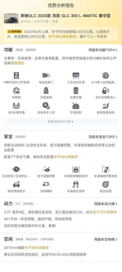 综上所述,奔驰GLC 2020款 改款 GLC 300 L 4MATIC 豪华型在外观、内饰、动力、配置、驾驶感受等方面都表现出色。无论是日常代步还是长途旅行,它都可以为乘客提供舒适的乘坐环境和出色的驾驶体验。如果你正在寻找一款豪华SUV,那么这款车绝对是一个不错的选择。