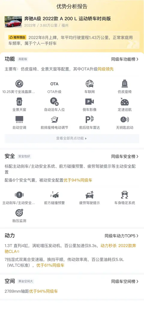 首先来了解一下这辆二手奔驰A级的基本情况,该车具体版本是——奔驰A级 2022款 A 200 L 运动轿车时尚版,2022年8月上牌,跑了3.8万公里,红色车身深色内饰,国VI排放标准,车源地和上牌地都是福州,0过户记录。新车指导价26.48万,目前二手报价13.5万。