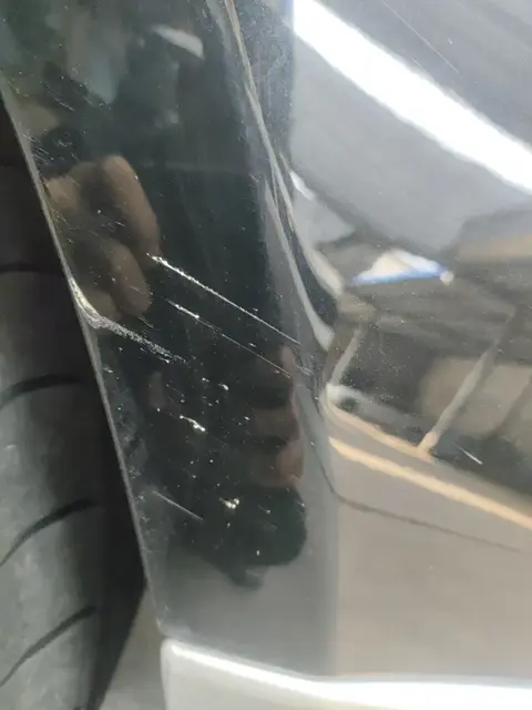 在外观检测中,这辆车在左后翼子板处和右后翼子板处都有轻微的损伤,具体瑕疵如下图所示。