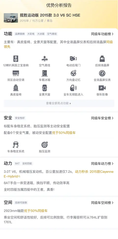 这辆车的具体版本是揽胜运动版 2015款 3.0 V6 SC HSE,上牌地为青岛,上牌日期2015年4月,表显里程15万公里,新车指导价104.8万,二手车报价21.5万,过户次数2次,车身颜色为白色。