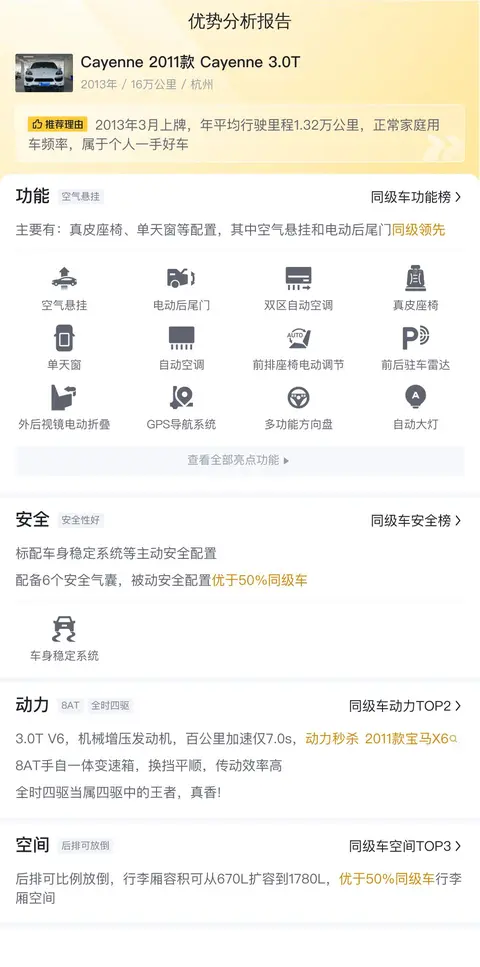 综上所述,我们对这辆2011款保时捷Cayenne 3.0T的了解就差线下见面了。这车在配置、动力、安全和舒适性方面的表现都相当的出色,体现了保时捷作为豪华汽车品牌的实力。如果你打算买它,建议你找专业人士对车辆进行全面的检查,特别是发动机、变速箱、底盘等核心部件,以及内饰的磨损程度,以确保车辆的实际状况符合卖家的描述。只有全面了解了车辆的情况,才能做出明智的购买决策。最后,希望你能早日找到心仪的车型,享受驾驶的乐趣!