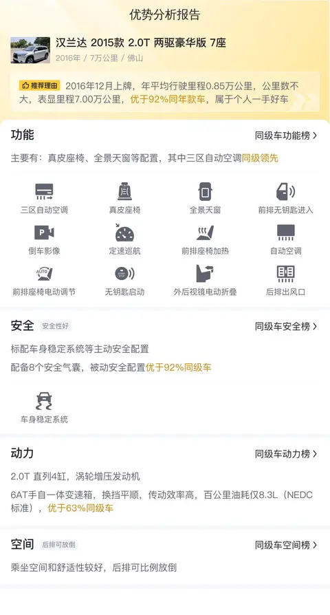 综上所述,这辆汉兰达2015款2.0T两驱豪华版7座车型在车况、配置、空间、动力等方面都有着不错的表现。虽然在外观和内饰检测中发现了一些瑕疵,但整体来看并不影响车辆的正常使用。如果您正在寻找一款既能满足家庭出行需求又能兼顾商务用途的SUV,那么这辆车或许是一个不错的选择。