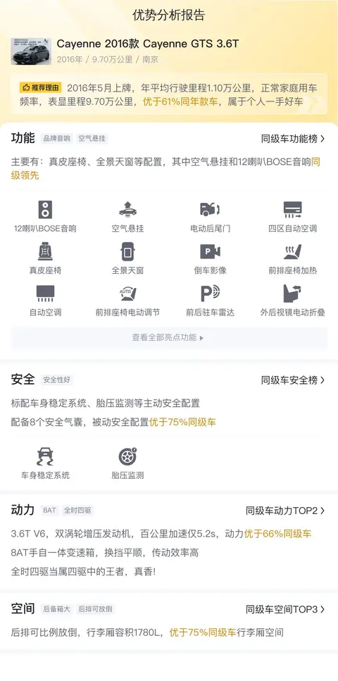 综上所述,在考虑购买这辆二手Cayenne 2016款 Cayenne GTS 3.6T时,除了吸引人的报价外,车辆的良好车况、丰富的功能配置、出色的动力性能和宽敞的空间表现都是值得考虑的因素。然而,购车决策应基于个人需求、预算和实际车况综合考量。如果您对这款车感兴趣,不妨亲自前去试驾体验,相信它会为您带来不一样的驾驶感受。