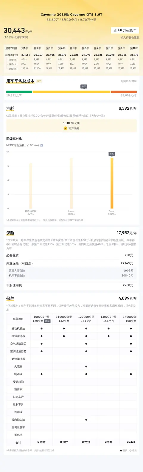 在购置二手车时,除了初始购车成本外,还需要考虑日常使用和维护的成本。根据估算,这辆Cayenne的年均综合使用成本大约在3万元左右。这里值得注意的是,实际费用可能会根据车辆使用频率、维护状况和地区消费水平等因素有所变动。
