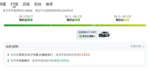 价格方面,这辆车目前的售价为27.98万,预计再行驶2年后可卖23万,约折价15.3%。