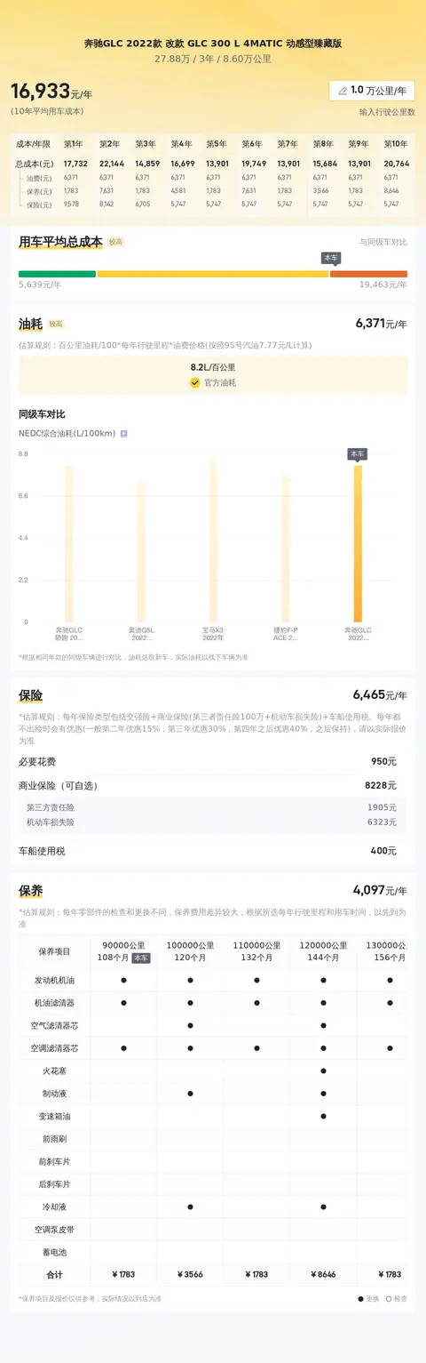 根据懂车帝大数据分析,这辆奔驰GLC 2022款 改款 GLC 300 L 4MATIC 动感型臻藏版综合性价比指数为60%,当前市场行情价为27.88万,预计两年后可卖22.11万。在用车成本方面,如上图所示,该车10年平均用车成本约为17186元/年,而同级车最低10年平均用车成本为14468元/年,最高则可达21929元/年,相对来说该车的用车成本适中。