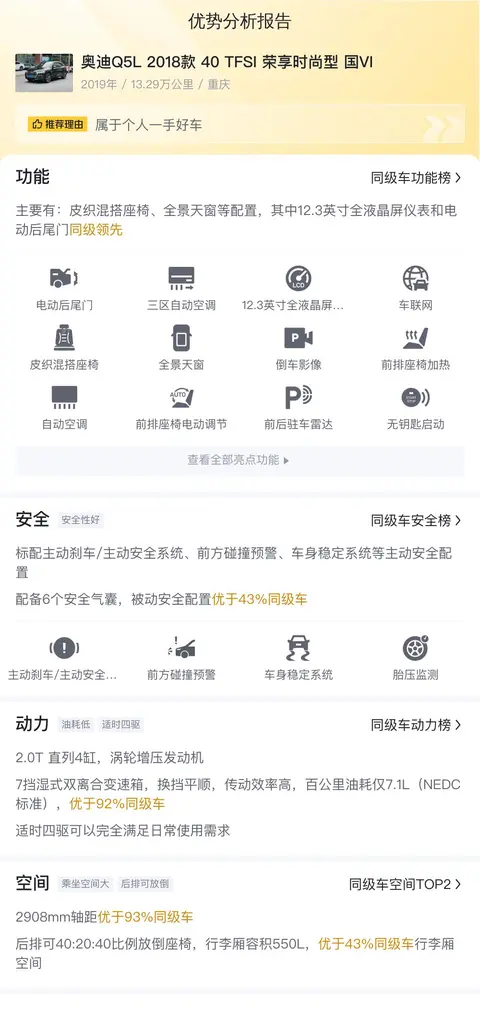 车况说完了,咱们聊聊这辆车的配置。这辆车具有皮织混搭座椅、全景天窗等配置,其中12.3英寸全液晶屏仪表和电动后尾门同级领先。它的动力、空间也表现出色,2.0T直列4缸,涡轮增压发动机,7挡湿式双离合变速箱,换挡平顺,传动效率高,百公里油耗仅7.1L(NEDC标准),优于92%同级车。2908mm轴距优于93%同级车,后排可40:20:40比例放倒座椅,行李厢容积550L,优于43%同级车行李厢空间。
