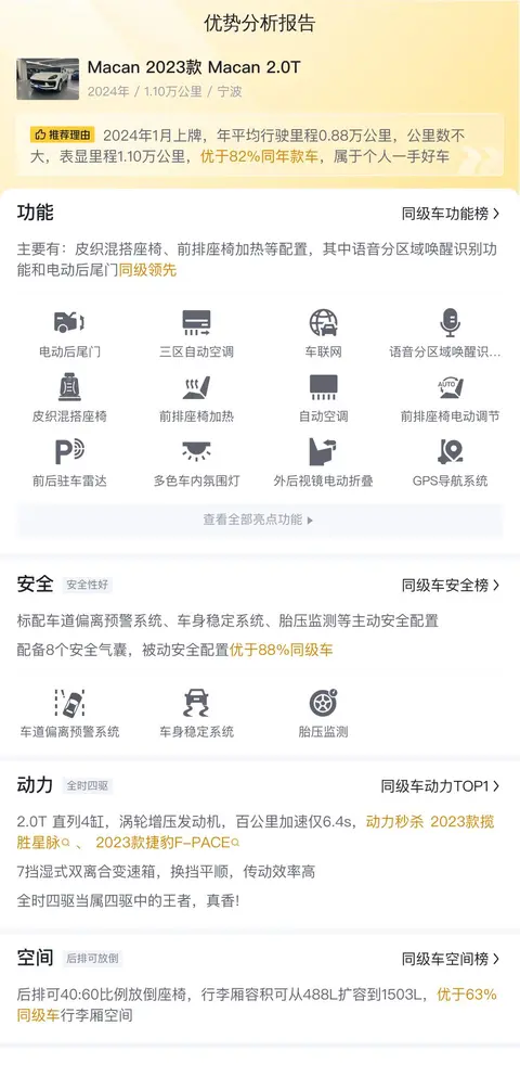 接下来,让我们深入了解这辆二手保时捷Macan的各项特点。首先,我们注意到它采用了2.0T涡轮增压发动机,这一配置为车辆提供了强劲的动力支持。百公里加速仅需6.4秒,彰显了Macan出色的加速性能。同时,全时四驱系统的配备使得Macan在各种路况下都能保持稳定的行驶状态,为驾驶者带来更加安心的驾驶体验。