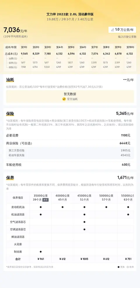 经过懂车帝综合分析,这款车10年平均用车成本约为每年1.2万元,其中包括油费约5280元/年,保养费用约3380元/年,保险费用约5400元/年。