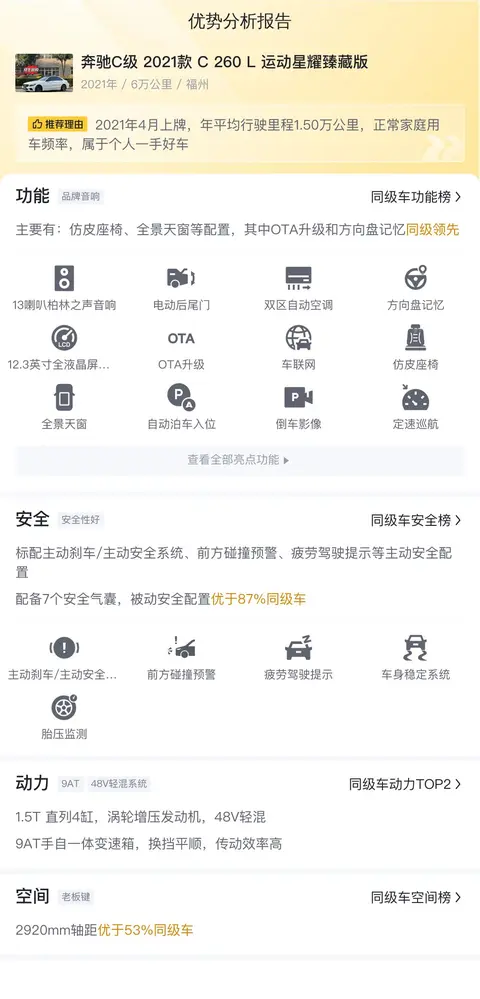 接下来我们说一下大家关心的用车成本部分,根据估算,这辆奔驰C级2021款 C 260 L 运动星耀臻藏版的年均综合用车成本约14181元/年,这项花销是跟车主的实际用车场景和使用强度有直接变化的。好了,以上就是我们对这款车的全部介绍了。