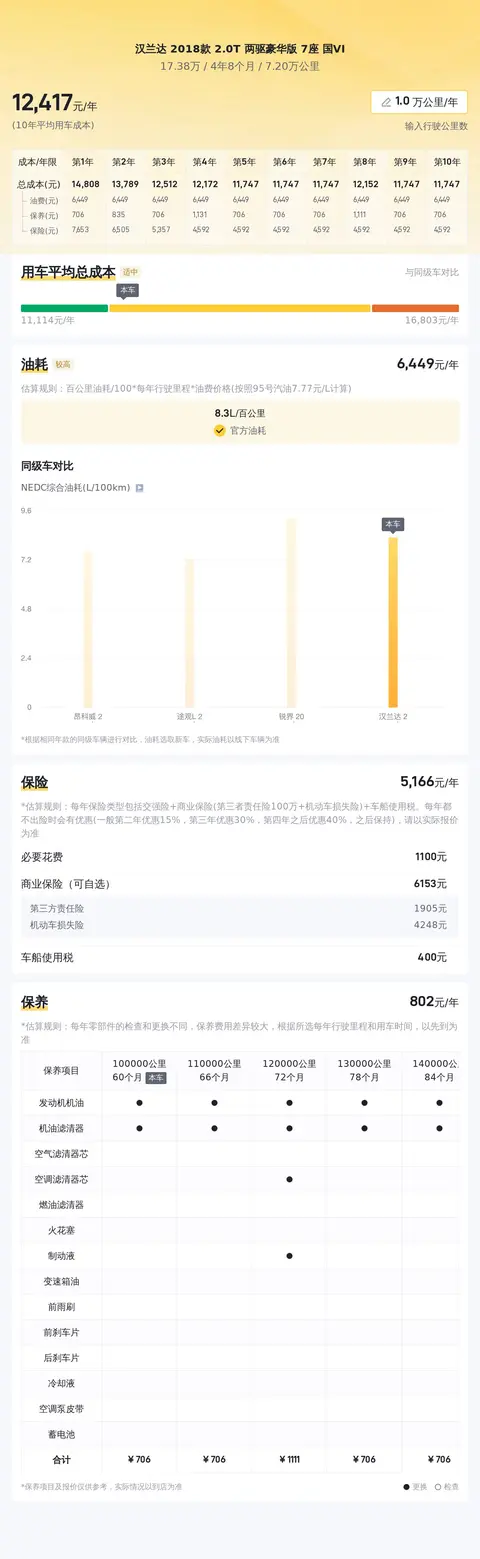 在用车成本部分,根据懂车帝对汉兰达 2018款 2.0T 两驱豪华版 7座 国VI的分析,它的10年平均用车成本大约在12180元/年,这个用车成本金额是个大致的参考范围,具体的实际费用开销可能会根据车主的实际使用情况有所差异。