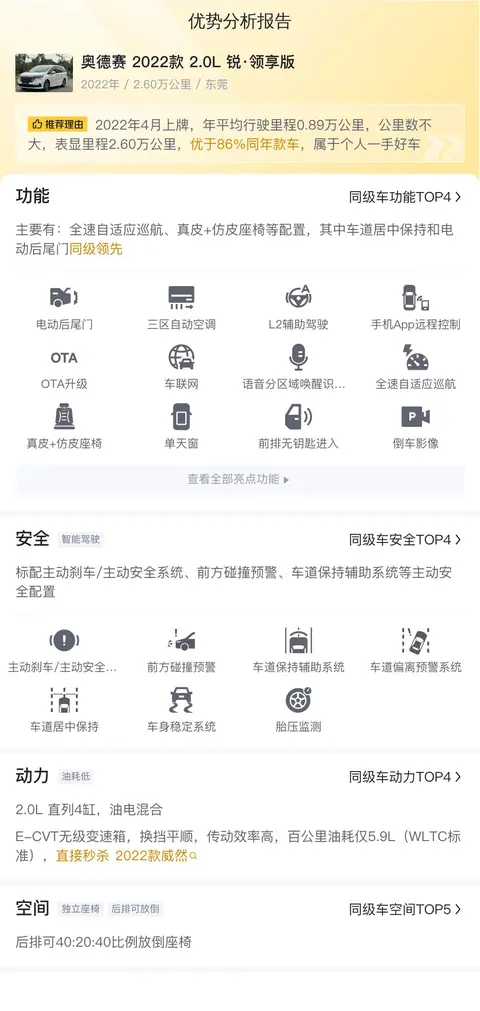优点:定价比较实惠,奥德赛 2022款 2.0L 锐·领享版的市场行情价是18.98万-23.11万,这辆车的报价是18.98万,属于比较低的价格了,同时保值率也高。里程低,使用时间短,配置丰富,尤其是混动车型动力平顺,油耗低,很适合家用代步出行。